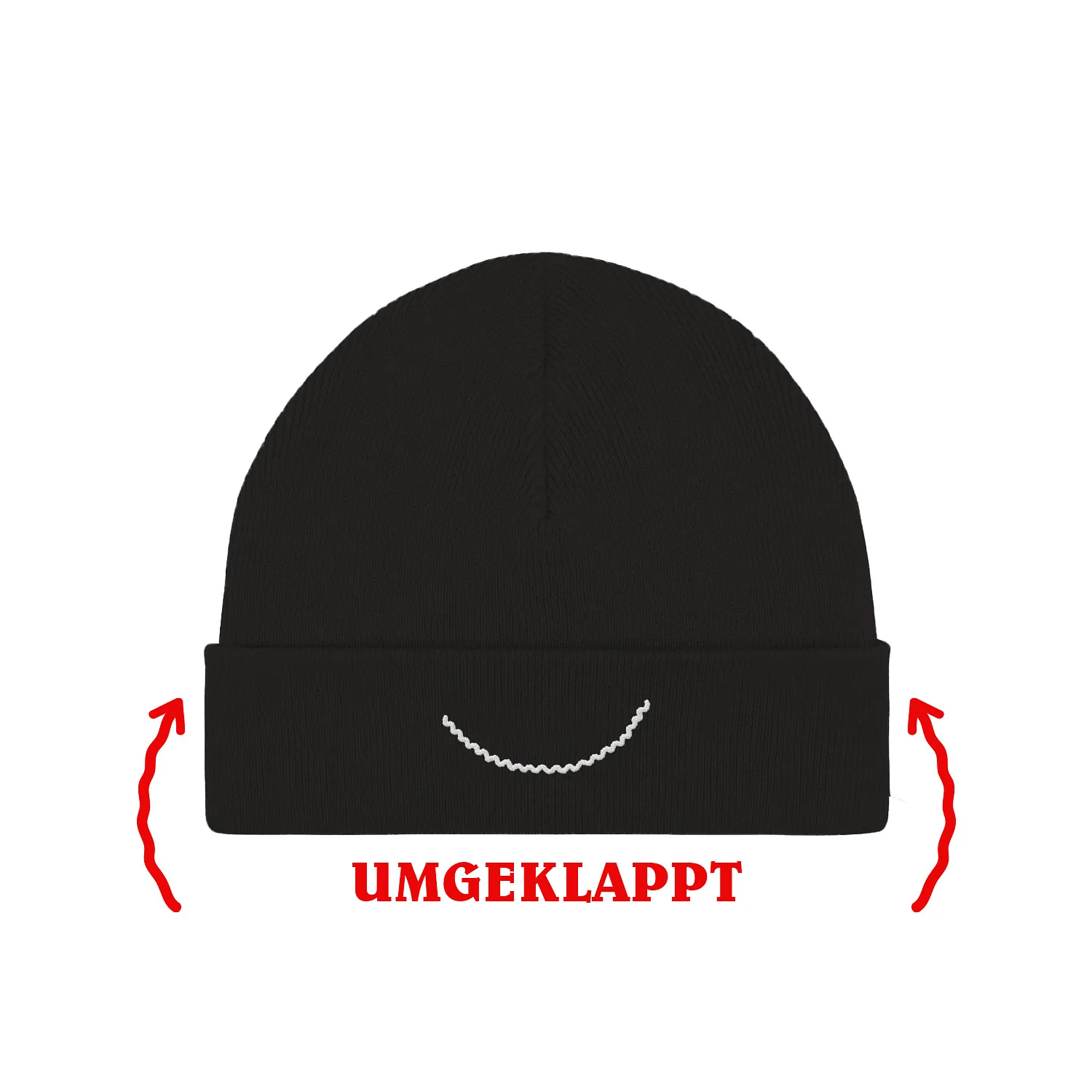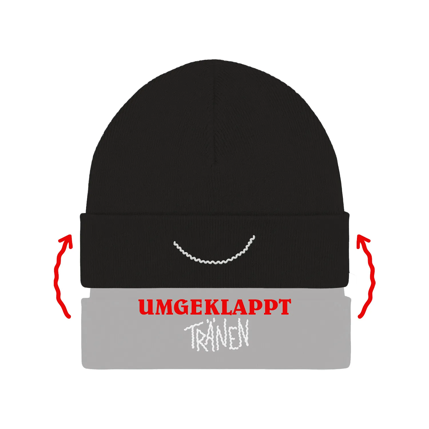 Ist die Krempe einmal umgeschlagen kann die Beanie mit dem "Tränen" Logo getragen werden. Ist die Krempe zweimal umgeschlagen kann die Beanie mit dem "Tränen Mund" getragen werden.